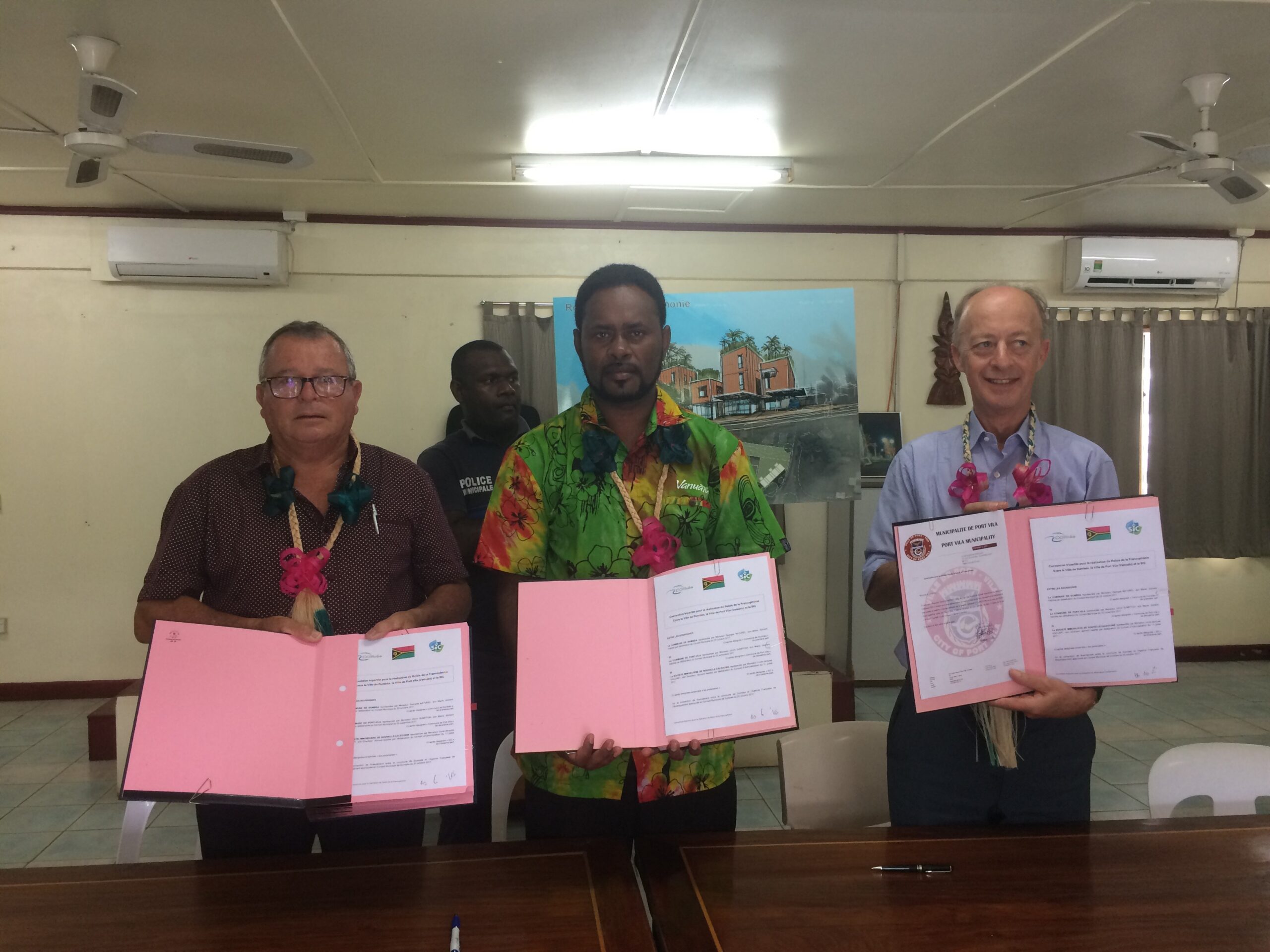 Samedi 2 décembre à Port Vila, Louis-Jacques Vaillant a signé avec Ulrich Sumptoh, Maire de Port Vila et Daniel Blaise, premier adjoint au Maire de Dumbéa une convention tripartite concernant le premier projet de coopération internationale de la SIC.