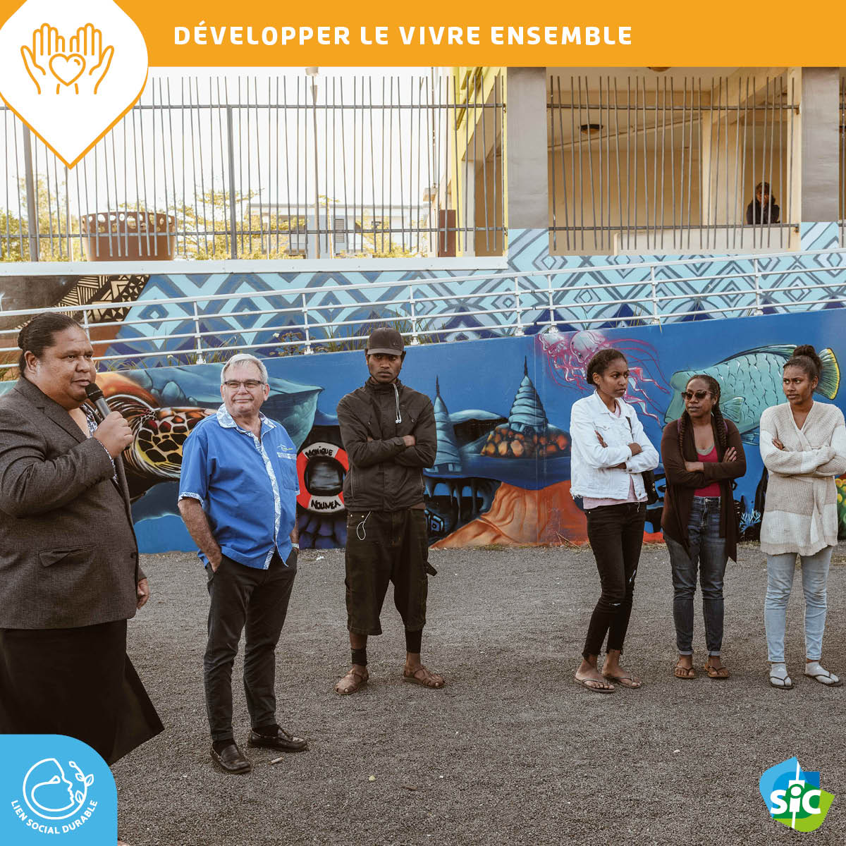 Cette œuvre est le fruit d’un « chantier de socialisation » co-financé par la Ville de Dumbéa et la SIC. Son principe : faire travailler pendant une semaine des artistes professionnels avec des jeunes issus des quartiers de la commune et ainsi favoriser leur insertion sociale et professionnelle, avec l’appui des encadrants de l’Association Calédonienne pour le Travail et l’Insertion vers l’Emploi (ACTIVE).